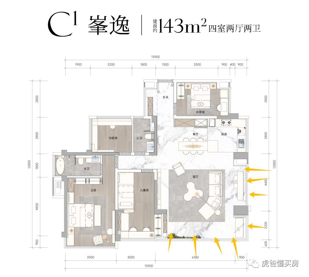 就产品本身来说,能忍住不作妖,不搞高低配,就已经是一种胜利了,更何况户型的确设计的不错,特别是143做客厅主卧做5.6米以上大开间的情况下,还能搞出3卫及4房。