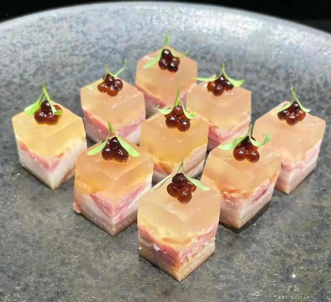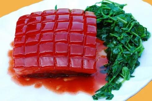又名水晶肴蹄、镇江肴肉,是江苏省镇江市的一种传统特色名菜,属于苏菜系。该菜品成菜后肉红皮白,光滑晶莹,卤冻透明,犹如水晶,故有“水晶”之美称。食用时,具有瘦肉香酥、肥肉不腻、酥香嫩鲜等特点,佐以姜丝和镇江香醋,更是别有一番风味。