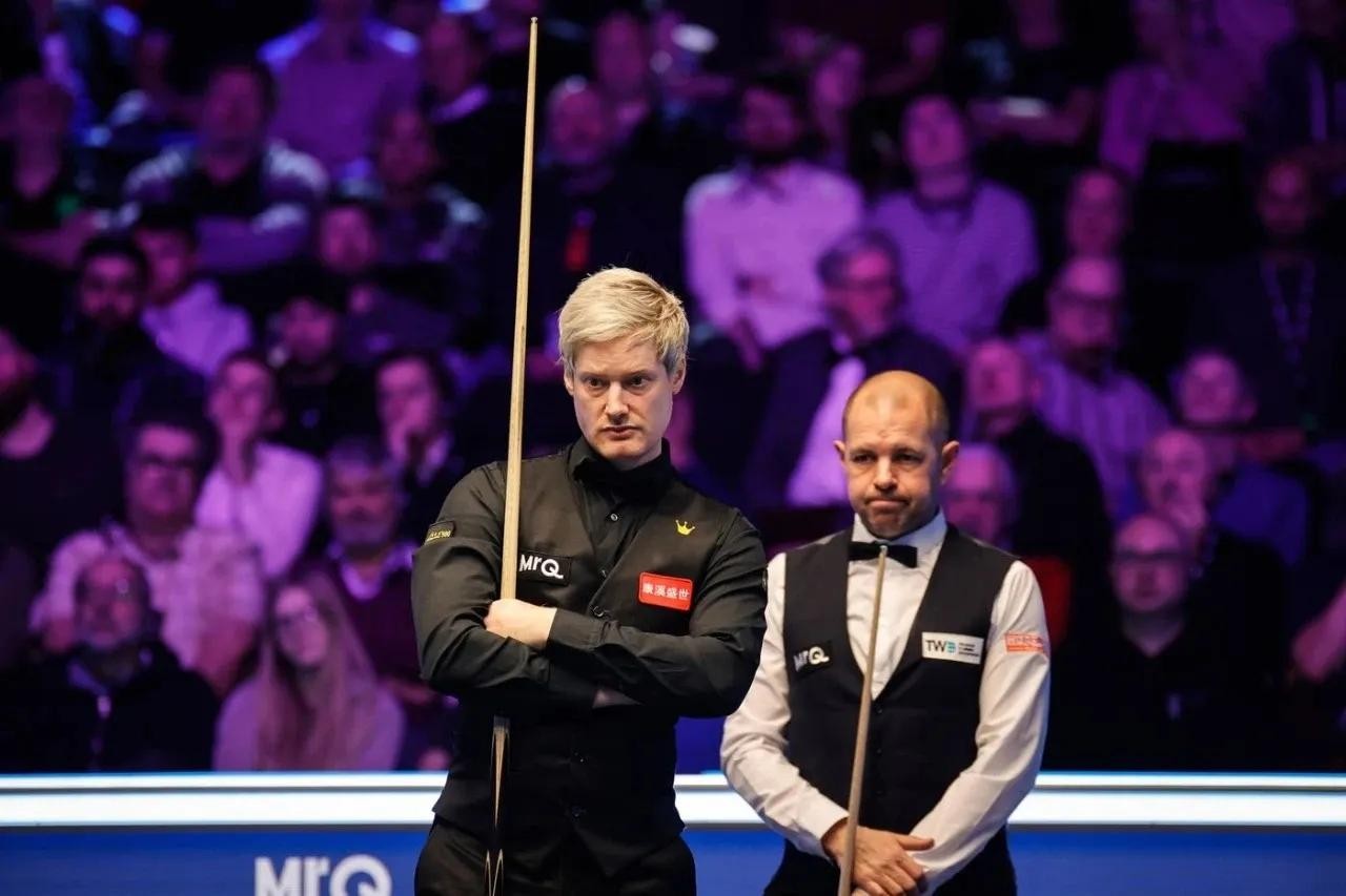 第二场比赛,尼尔罗伯逊对阵巴里霍金斯。尼尔·罗伯逊是本赛季表现最差的 TOP16,目前单赛季排名仅为88位,并且有极大可能在赛季末跌出 TOP16。