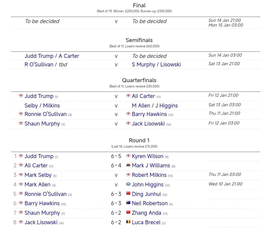 1月10日早,斯诺克大师赛结束第三个比赛日。卫冕冠军特鲁姆普在0-3落后的情况下,连赢五局最终逆转凯伦·威尔逊;大满贯选手尼尔·罗伯逊状态持续低迷,空砍两杆破百3-6不敌巴里·霍金斯。至此,八强已产生六个席位。