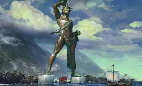 罗得斯岛巨像位于希腊罗得斯岛通往地中海的港口,是希腊人的太阳神、守护神赫利俄斯的形象。它与纽约的自由神像的高度差不多,高约33米。传说中雕像两腿分开站在港口上,船从其腿中间穿过,非常壮观有趣。