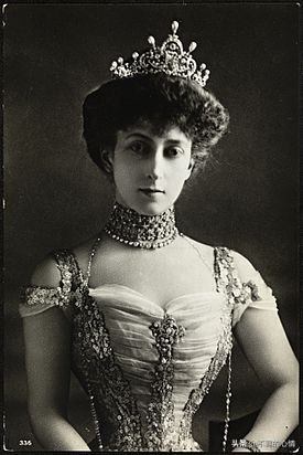 话说得有点远了,拐回来。亚历珊德拉虽然和丈夫因为情人而郁闷,但是作为威尔士王妃,该做的一样没有落下。她生育了6位子女,出席各种活动,在丈夫登基后,更是将英国以及王室,从沉重的维多利亚后时代解脱出来。王室和民众再也不用和孀居只穿黑衣的女王那样,过着没有颜色、沉闷无聊的生活。亚历珊德拉以她姣好的容貌,出众的气质将英王室的华服礼服衬托得更加灵动美丽。上流社会开始了新的欢快的生命,最著名的就是现在还能看到的“颈”链,亚历珊德拉就是这个装饰品的开山鼻祖,其实只是为了遮盖自己那里的一个小伤疤。