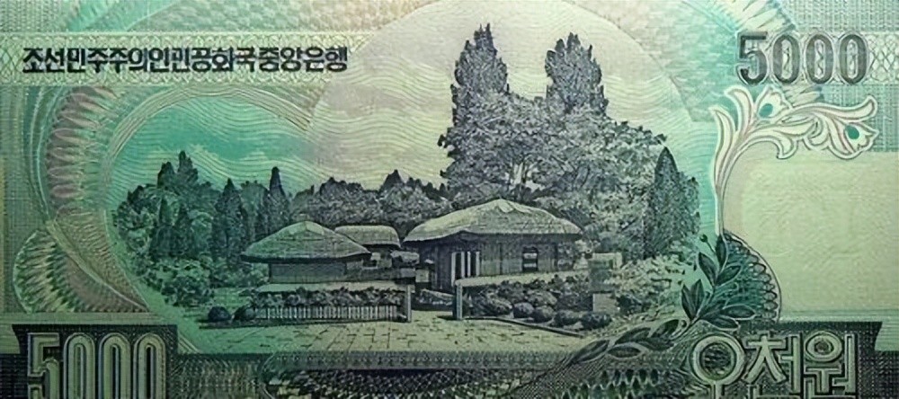 5000圆:正面为金日成像,背面为金日成故居“万景台”。