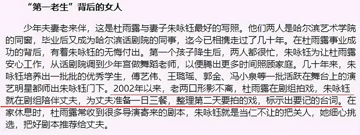 2002年,朱咏钰退休后,把自己空余的时间全部留给了杜雨露,她跟在丈夫身边,陪他到剧组拍戏,帮助他整理通告、标注台词,丈夫忙时,她还为他对剧本进行把关。