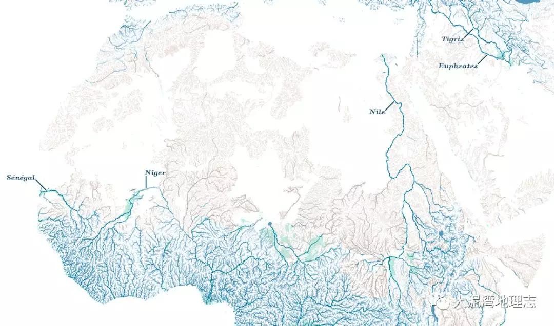 此外,可以清晰地看到中低纬度干旱地带河流稀少。
