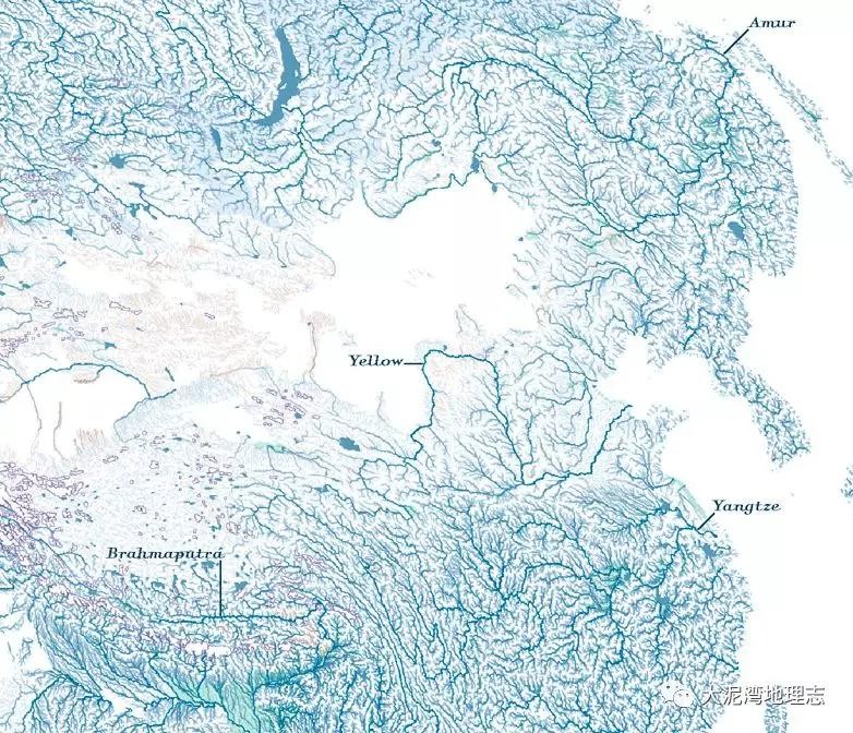 亚洲中部高原、山地为众多河流源地这一点也能从图中读出。可以点击图片放大仔细查看。