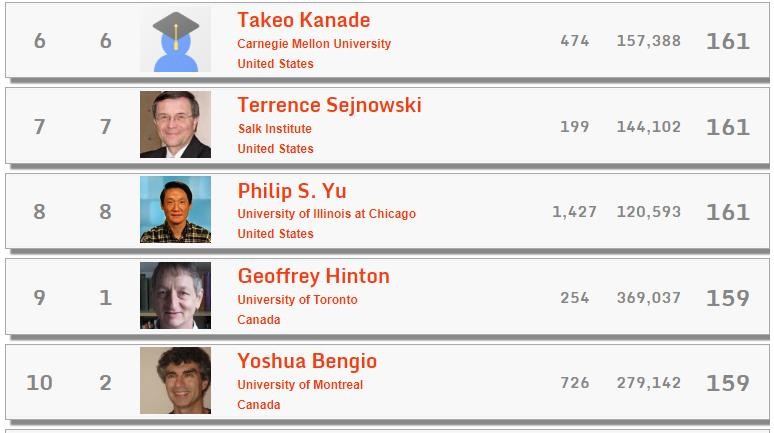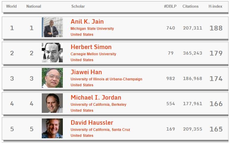 按照中国人比学赶超的精神来说,最终赶上美国,只不过是时间上的问题而已。毕竟华人的智慧摆在那里,这点在此次榜单中top 10 计算机科学家中有两位华人学者即可得到验证,这两位华人分别是伊利诺伊大学香槟分校计算机系教授韩家炜(Jiawei Han)和伊利诺伊大学芝加哥分校信息技术教授俞士纶(Philip S. Yu),分别排在第3和第7名。