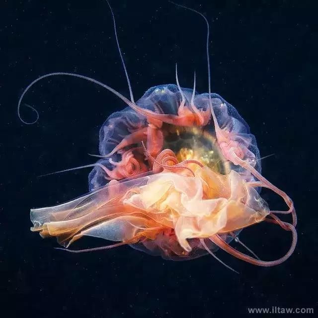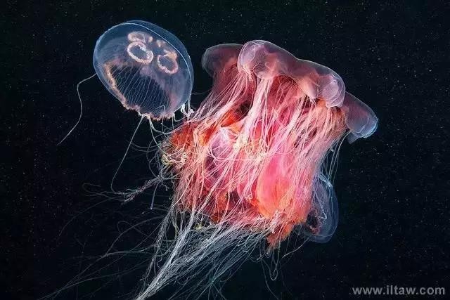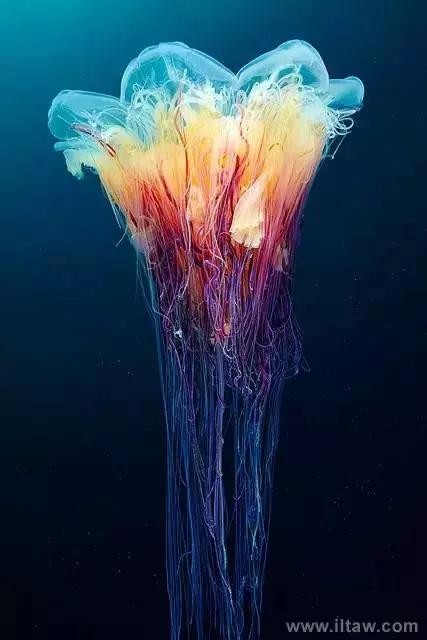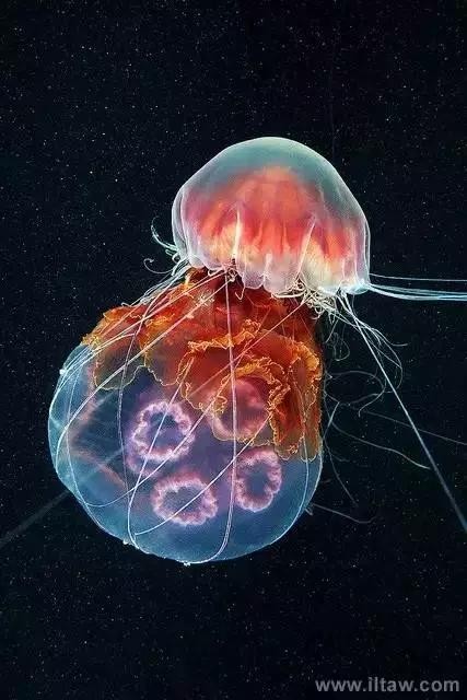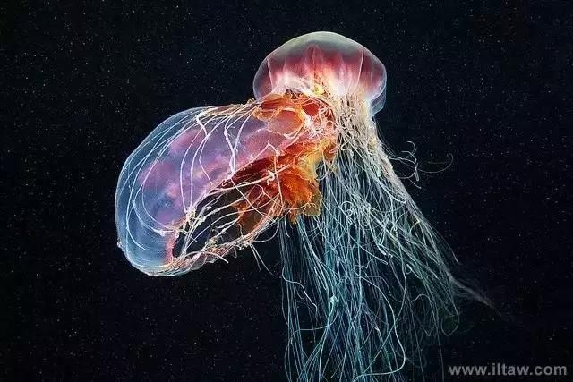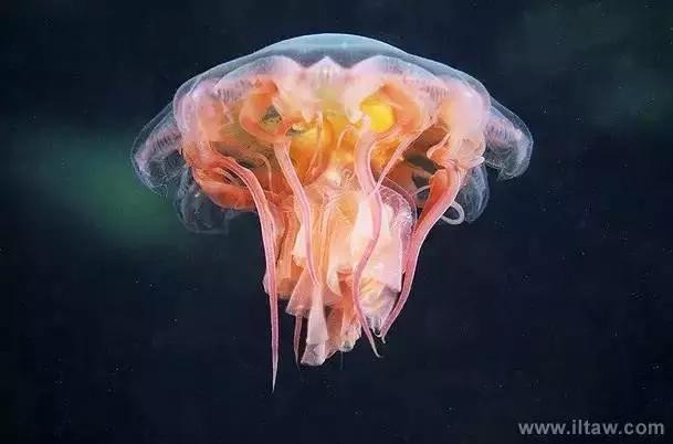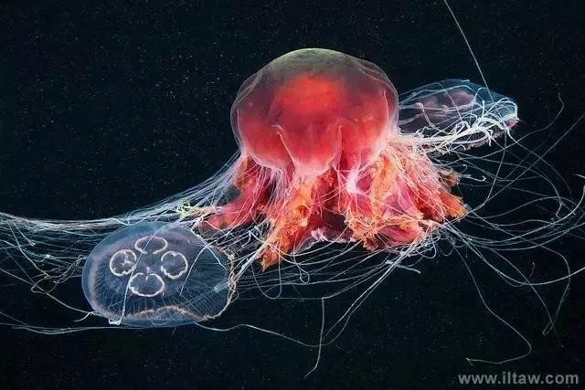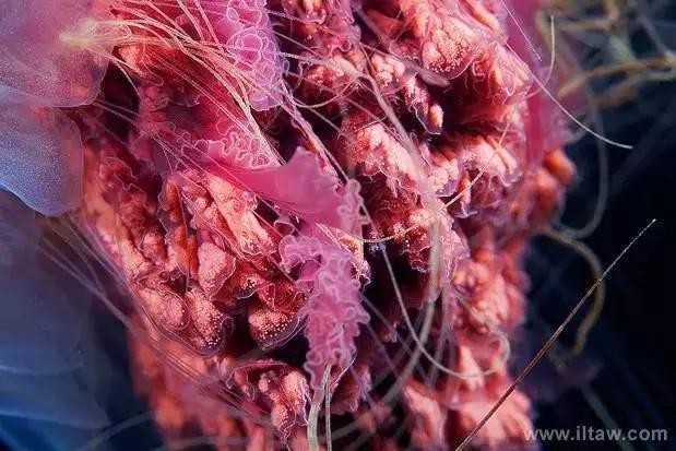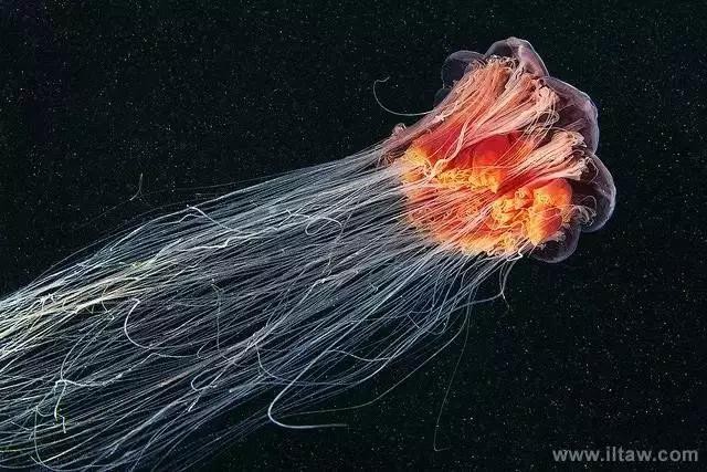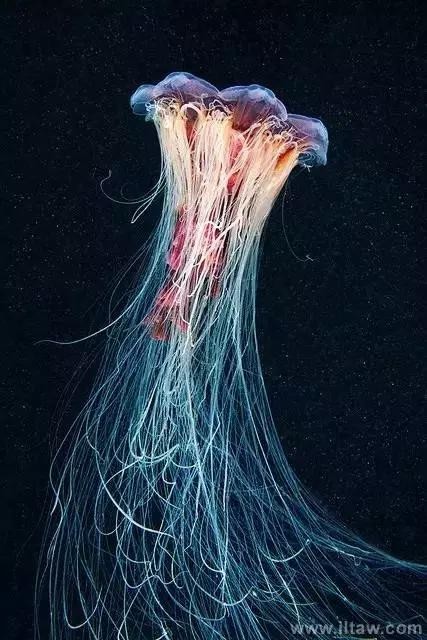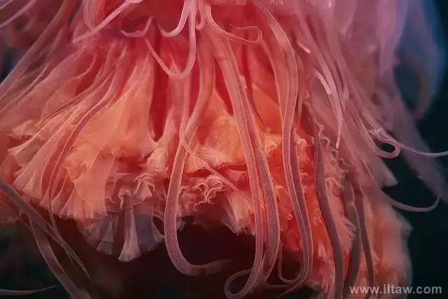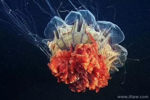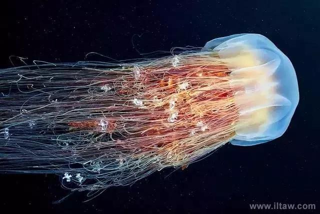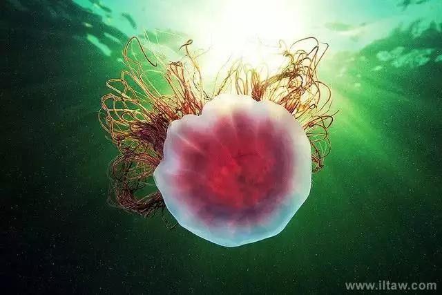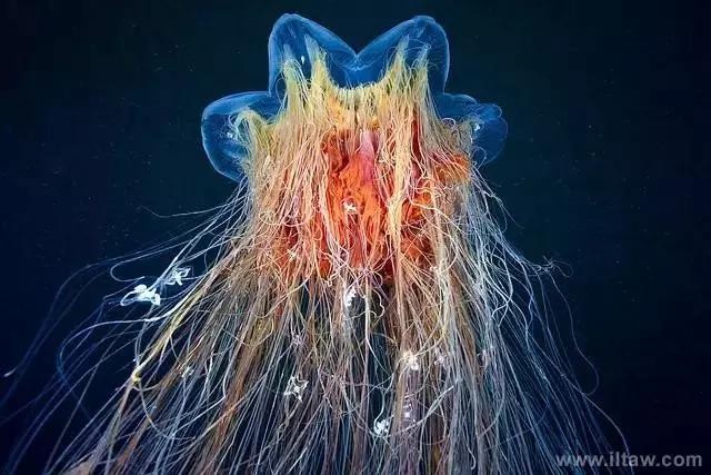 狮鬃水母因它嘴的周围有橙黄色的触手像鬃毛般飘逸而得名。其伞形躯体可达2米,重量200-400公斤,触手有八组,最多有150条,可长逾35米,用以捕捉食物和防御敌害。其颜色随年龄变化,由红变粉。