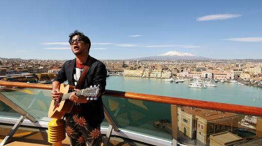 途中,游轮曾有整整九天没有靠岸,从夏威夷岛到横滨穿越太平洋。无际的大海上没有网络,所有的一切是最原始的状态。一日台风过后,远处横滨港的灯塔透出微弱的亮光,他便在歌里写道,“灯塔边的岸上有我的船,我的最初的梦灿烂依然”。(图、视频由受访者提供)