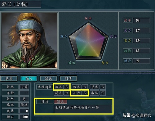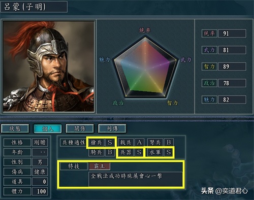身为整个三国志11游戏里兵种结构最完美的角色,甘宁的字还叫“兴霸”呢,确定不赏他一个霸王玩玩吗?从实用性的角度来说,甘宁匹配霸王特技的价值超过所有人,威风对于他来说真是过度的。