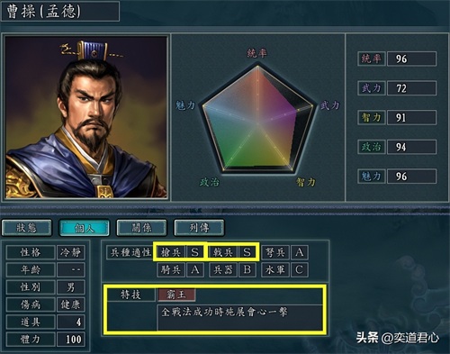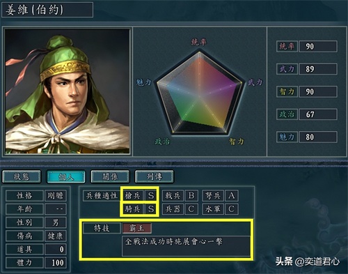 常山赵子龙身为蜀汉五虎上将之一,却在三国志11游戏里被区别对待,其他四位的攻击技能都是神字号,就他打人最不疼还漏气。对于那些嫌弃洞察特技的朋友们来说,把赵云改成霸王可谓是最常见的首选。枪、弩、骑都是S级,戟和水军也都过得去,既满足了情怀又兼顾了实用性。