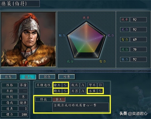 江东小霸王孙策原本在游戏里的勇将特技,其实就已经相当接近霸王了。只不过激发勇将的效果还有一道门槛,那就是武力值要高于对手。不少玩家会修改成霸王来消除这个门槛,把孙策的武力值彻底解放出来。尤其值得注意的是,孙策的水战功夫也是最顶尖的,除了射箭以外,他做到了无所不通。