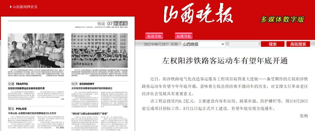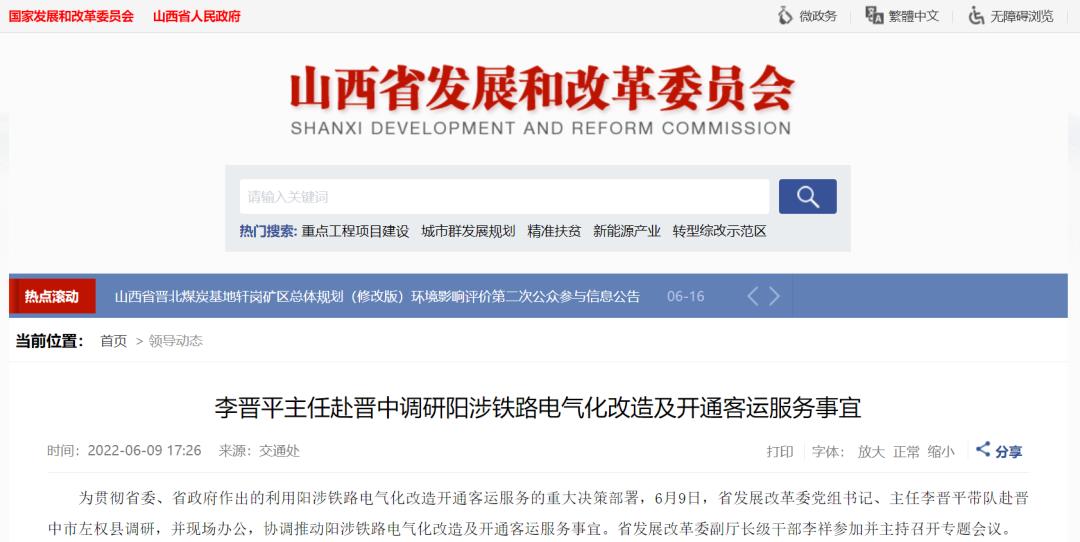 2022年6月9日,山西省发改委赴晋中市左权县调研,并现场办公,协调推动阳涉铁路电气化改造及开通客运服务事宜。