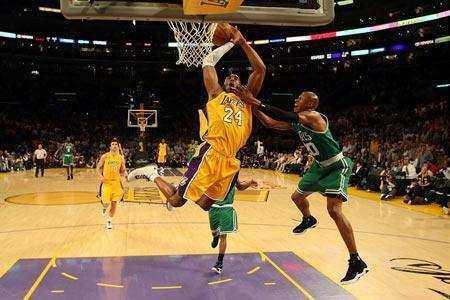2010年的总决赛,湖人队阵凯尔特人队的第一场,湖人队主场作战,发挥异常出色,全场压制着雷阿伦的发挥,让绿军的三巨头的连线没有完全打出来。科比得到30分+7篮板+6助攻,加索尔得到23分+14板的华丽数据,力压绿军大中锋加内特。湖人102-89击败凯尔特人,先拔头筹。