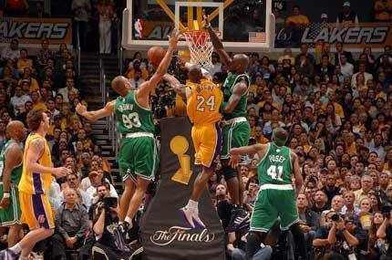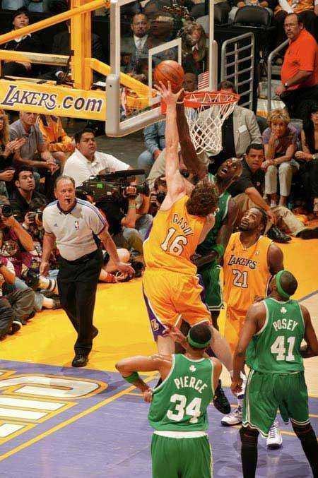 最后一战,两队都拿出最后一口气来争夺总冠军,这是NBA历史上的防守大战,双方的命中率都是低得可怕。科比24投6中,雷阿伦14投3中,加索尔16投6中,皮尔斯15投5中,可以想象,防守的程度和比赛的对抗性有多强。湖人队主场一度落后13分的情况下,靠着角色球员阿泰斯特和费舍尔的关键三分球,湖人队主场赢下了比赛,夺得了最艰难的总冠军。