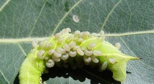 当毛虫体内的刻绒茧蜂幼虫成熟的时候,九会钻出毛毛虫的体内,这个过程简直让人头皮发麻(对于这张图,鬼知道我经历了什么),这个过程大概需要一个小时,当然在此之前这些幼虫会释放出某种化学物质让宿主毛虫处于瘫痪(可能相当于麻药),然后每条幼虫便开始慢慢各自钻出毛虫的身体,确保宿主不会疼死。